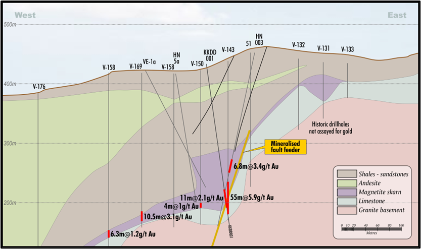 Twenty-six deep holes were drilled between 1970 and 1980. Historically, gold was not systematically assayed, with a focus on copper due to the requirements of the pre-democratic economy before 1992 and a number of these holes intersected significant copper mineralisation: